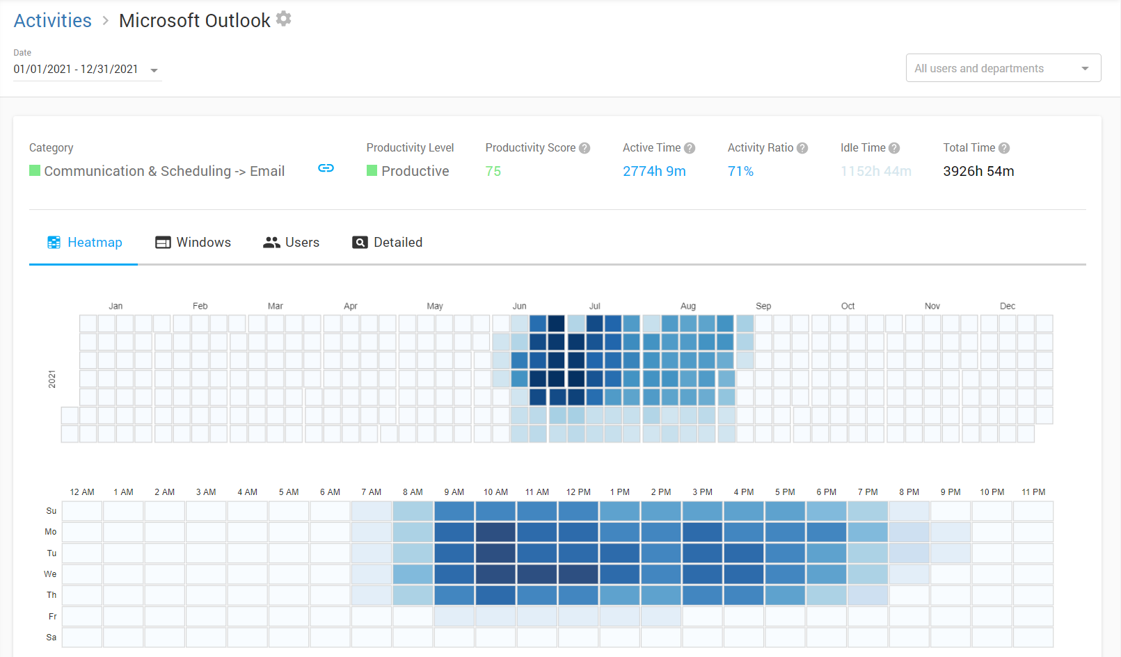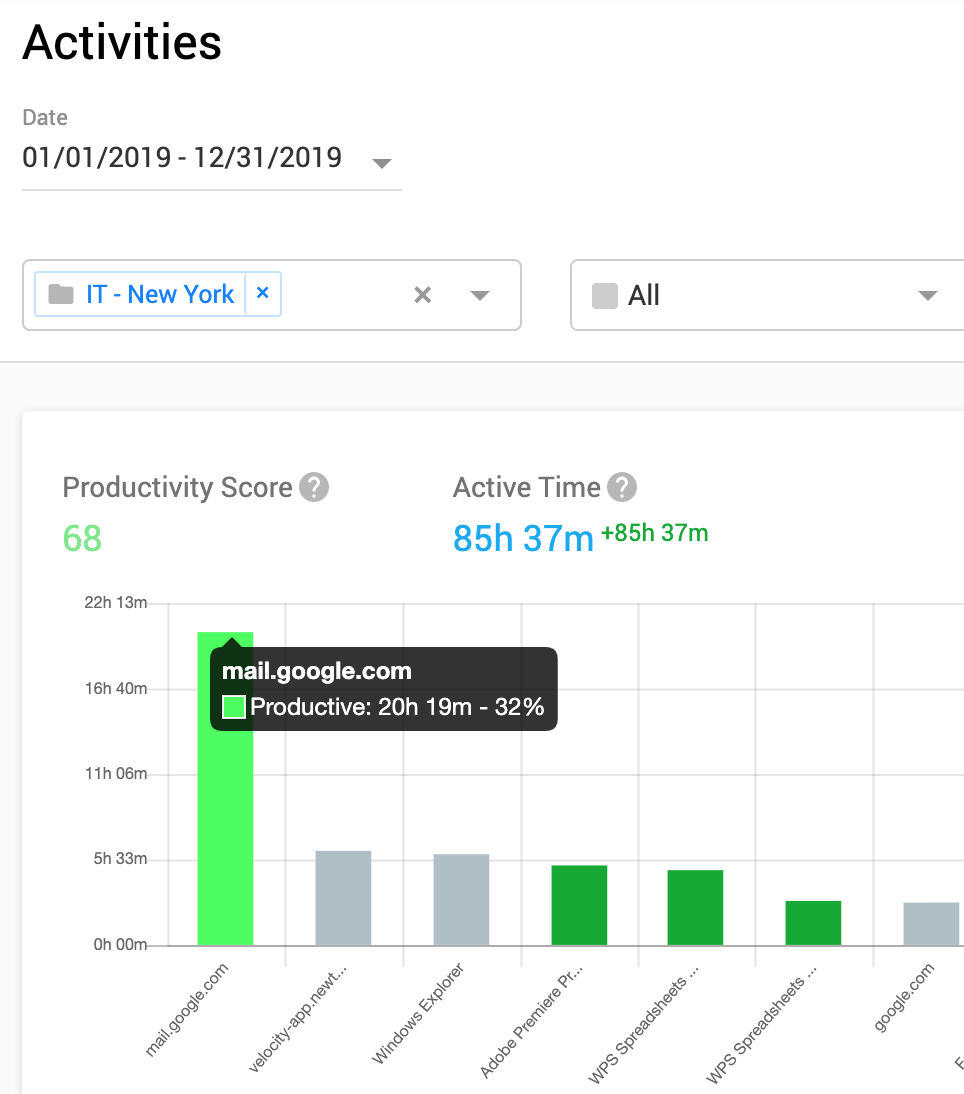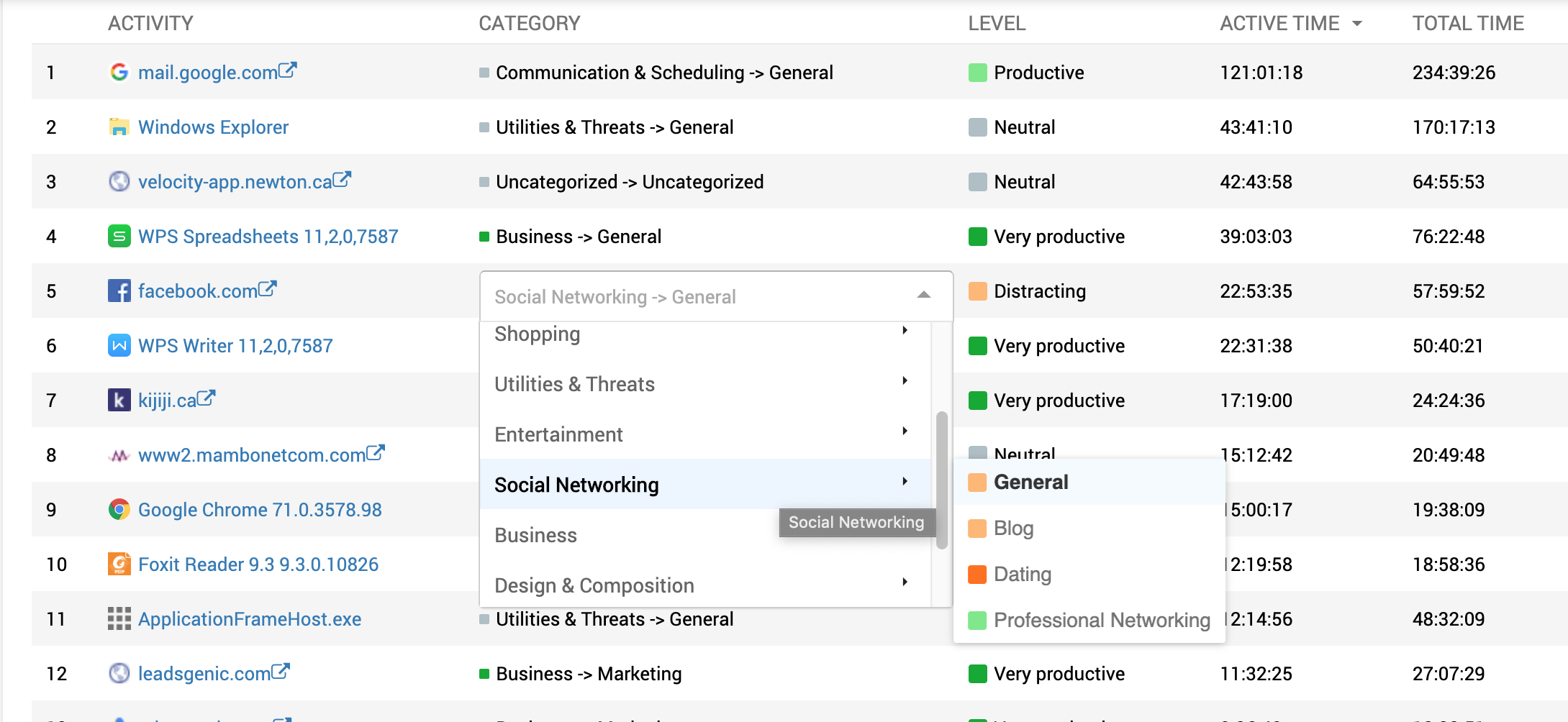 In this view, you will see a time distribution by activities (applications and websites). The table below shows application and website activities separated into categories and productivity levels. You’ll clearly see what activities take more time in your organization.