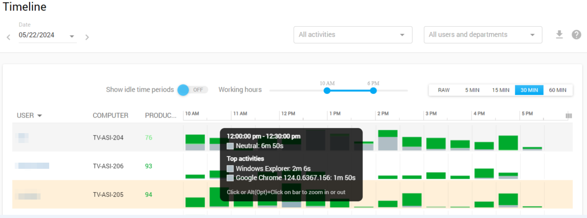 As for the summarized view, when you hover your mouse's cursor over any productivity bar, the system will show you the percentages of time that employee was idle, active, productive, neutral, or distracted.