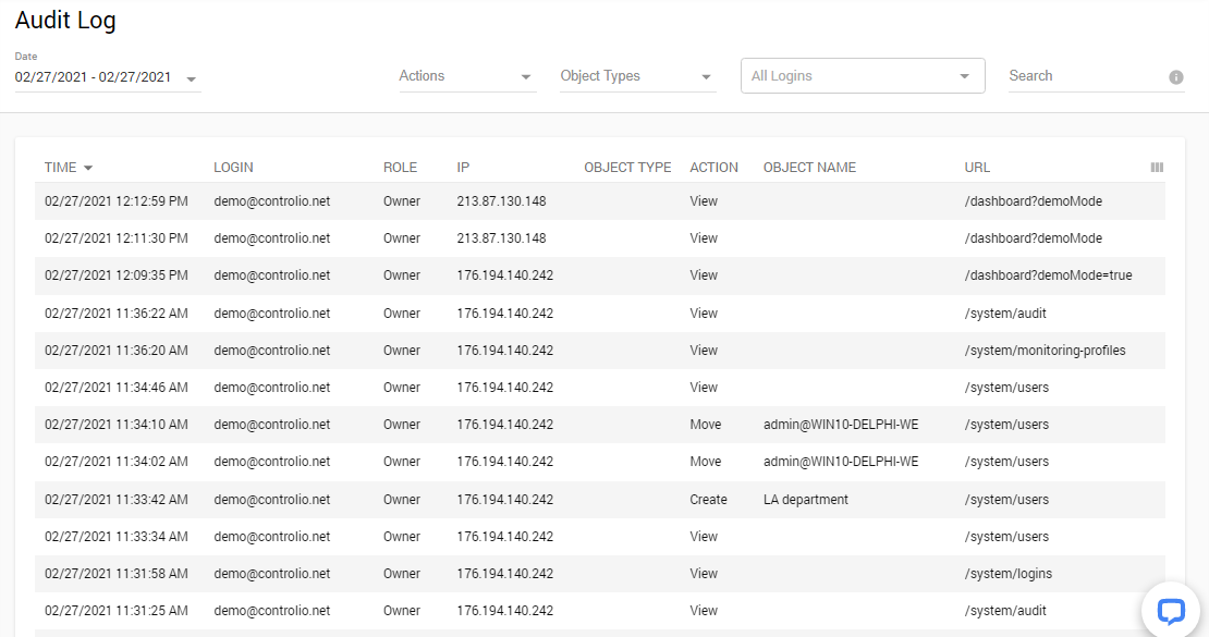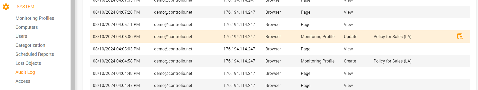 The Audit Log holds a record of each action an Admin/Manager/Employee makes on the Dashboard. (View/Export reports, Create/Update Behavior Rules, Delete users/computers, Update monitoring profiles, and Make adjustments to users’ profiles)
