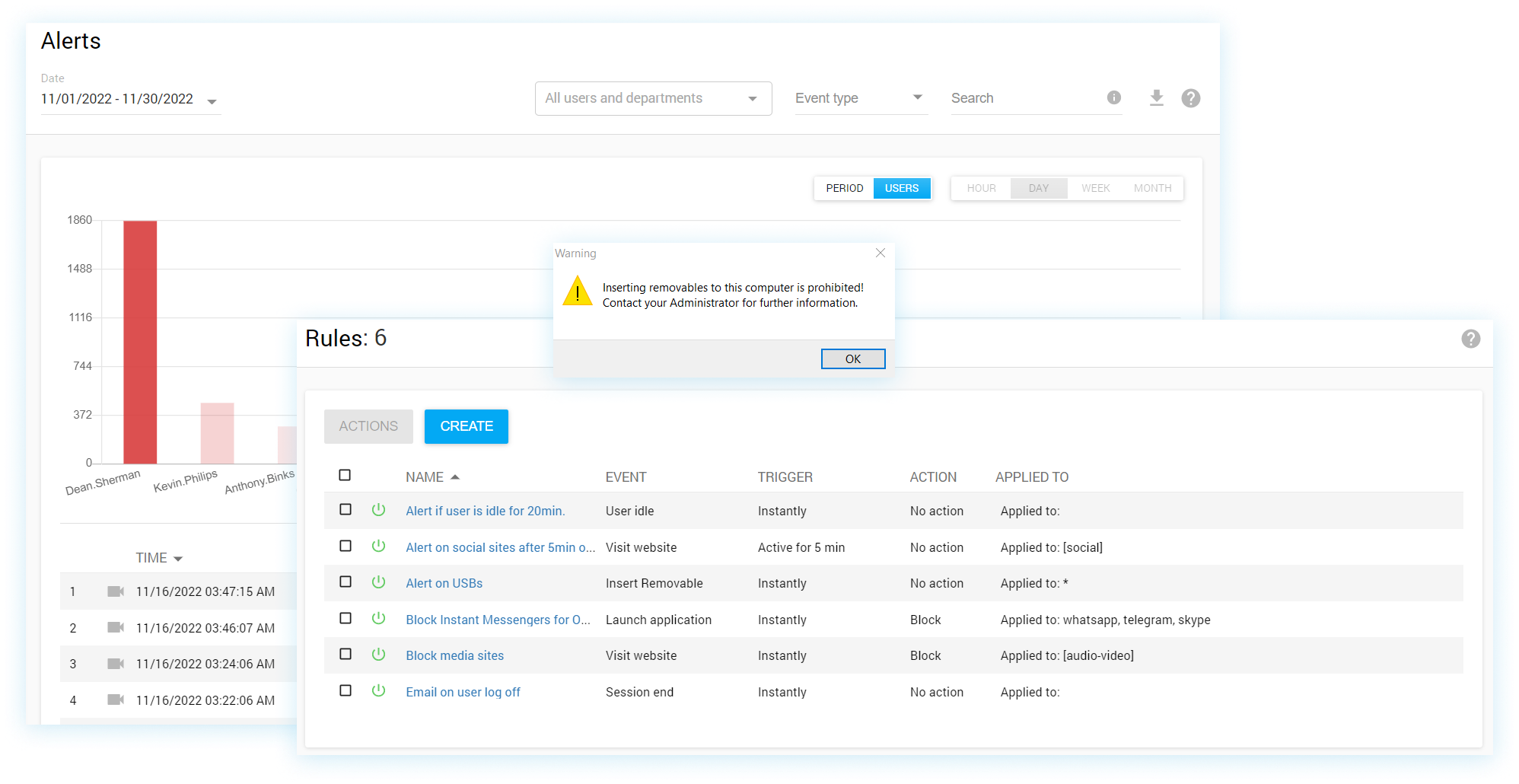 Protect your data assets from malicious insiders, reduce workplace misconduct risks, and neutralize productivity killers with the help of Think Track’s intelligent blocking features. You can block potentially harmful, inappropriate, and distractive websites, social media apps, and nonwork messengers or forbid inserting USB flash drives based on employees’ roles and work schedules.