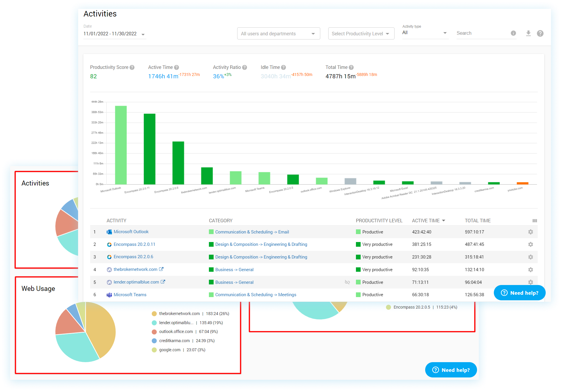Spot which computer-based activities consume your employees’ work hours the most and learn whether or not these activities correspond to their job duties. Having visibility into which apps and websites are being used by your staff will help identify work discipline violations, useless tools clogging your inventory, and even gaps in security enabling you to develop appropriate measures and put an end to the waste of time and resources.