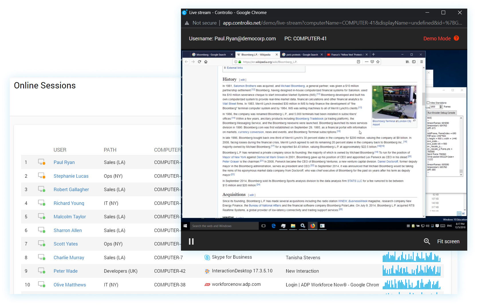 Keep your finger on the pulse by assessing employee activity in real time, and give timely guidance to mitigate productivity loss, and deflect malicious behavior. The Online Sessions report clearly shows which activity each employee is interacting with while granting optional access to the live stream of his screen.