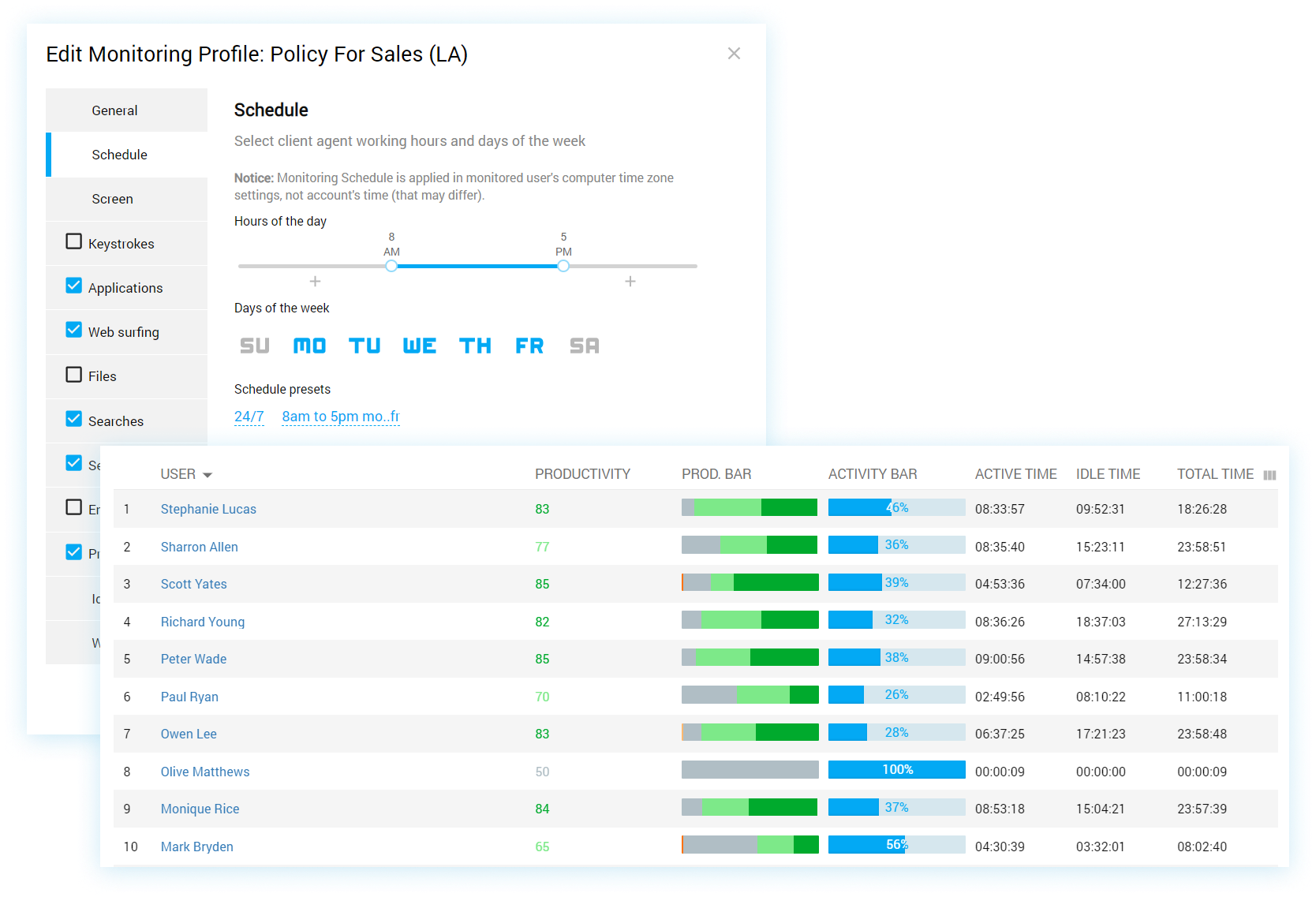 Analyze employees activity patterns to determine when employees are focused on a single task vs when they spend time switching between activities or utilize communication and scheduling tools. By analyzing the daily routines of top performers, you can enhance coaching strategies and drive higher productivity across the team.