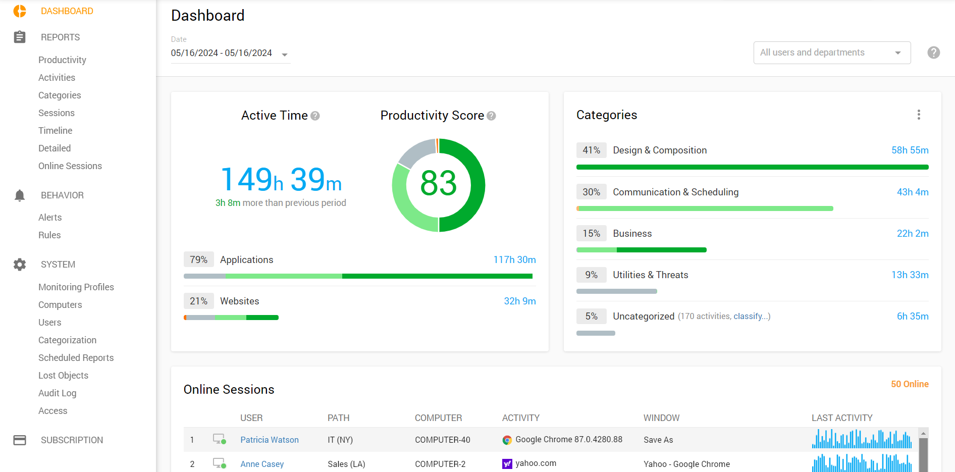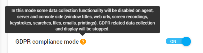 To achieve that, we have designed the GDPR compliance mode. In this mode, some data collection functionality will be disabled on the agent, server and console side (windows titles, web urls, screen recordings, keystrokes, searches, files, emails, printings). GDPR related data collection and display will be stopped.