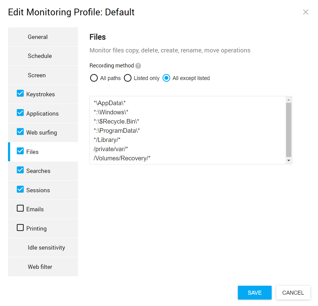 In this section, you can enable/disable capturing file operations (create, copy, rename, delete, move) on local drives as well as on external ones such as USB drives.