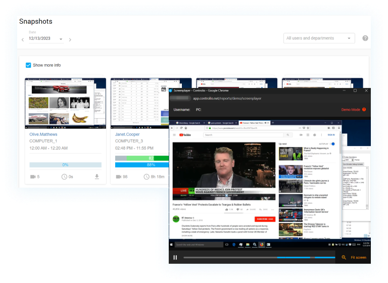 Avail of robust screen recording capabilities allowing you to inspect activity on multiple screens simultaneously