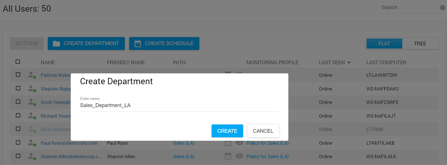 - Flat: shows all users of the account (from all departments) in a single list.