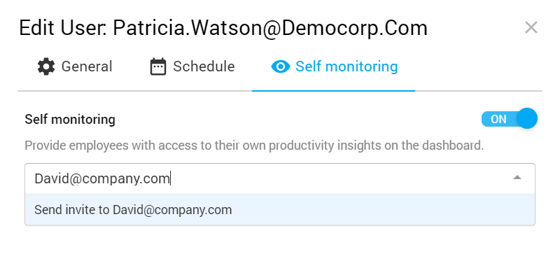 - Self-Monitoring Icon: Enable self-monitoring for the selected user(s) by assigning them to an existing employee login, or by specifying an e-mail address that will be given employee access.