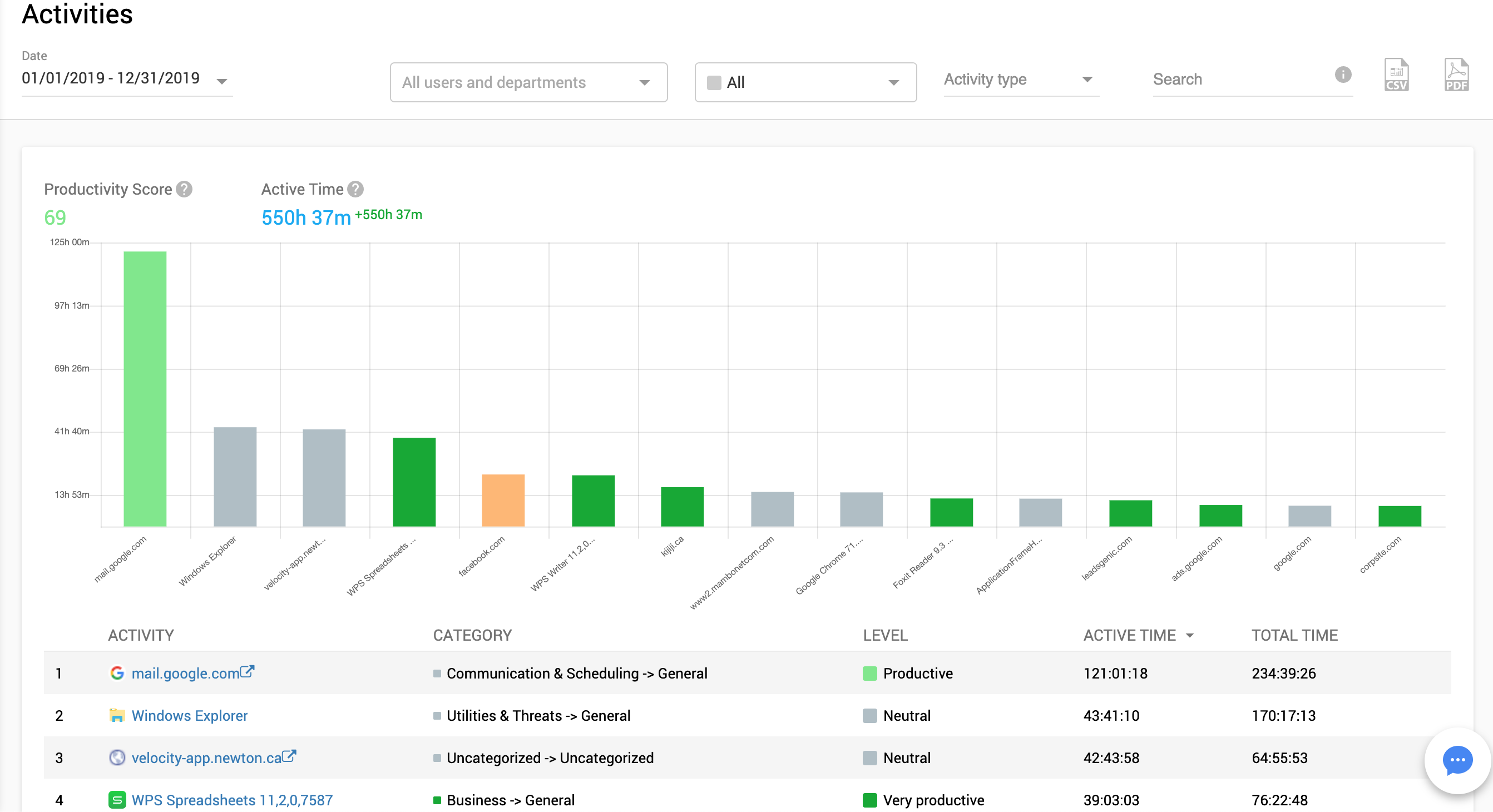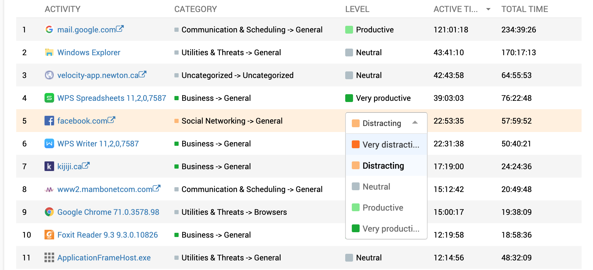 In this view, you will see a time distribution by activities (applications and websites). The table below shows application and website activities separated into categories and productivity levels. You’ll clearly see what activities take more time in your organization.