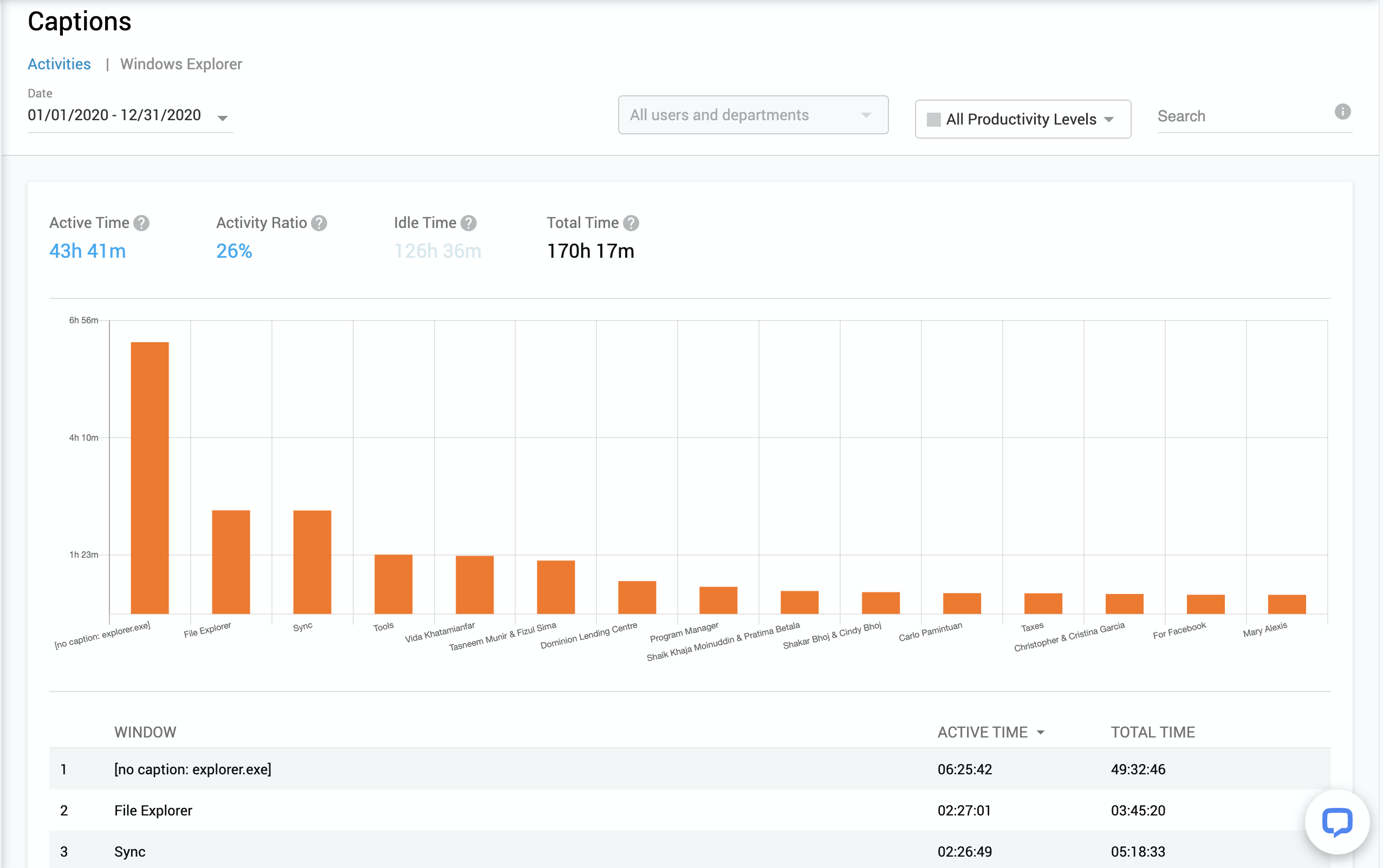 If you click on specific activity, you will be redirected to the Captions report for this activity – time distribution between application windows or web browser tabs (website urls):