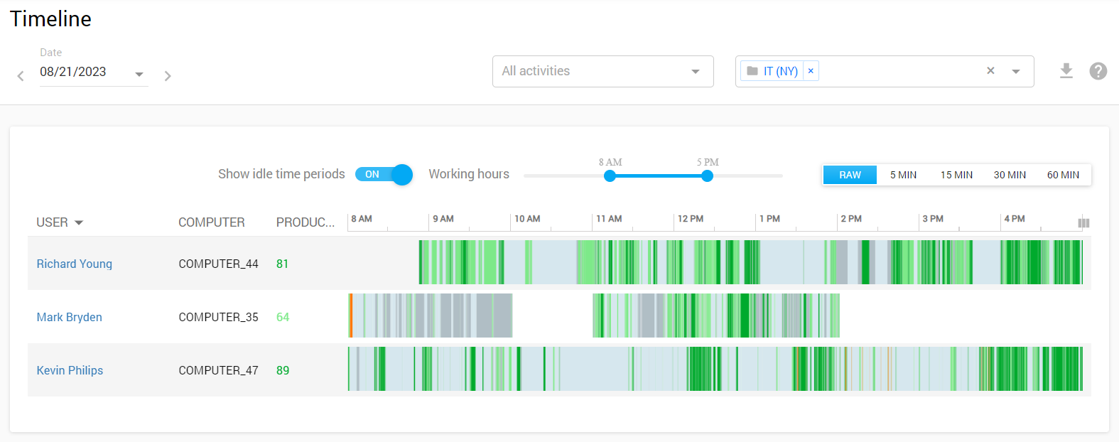This report gives reflects employee activity for a single day and measures productivity during working hours. Here, you can get a detailed (RAW) or a summarized view of employee activity for the chosen interval of time.