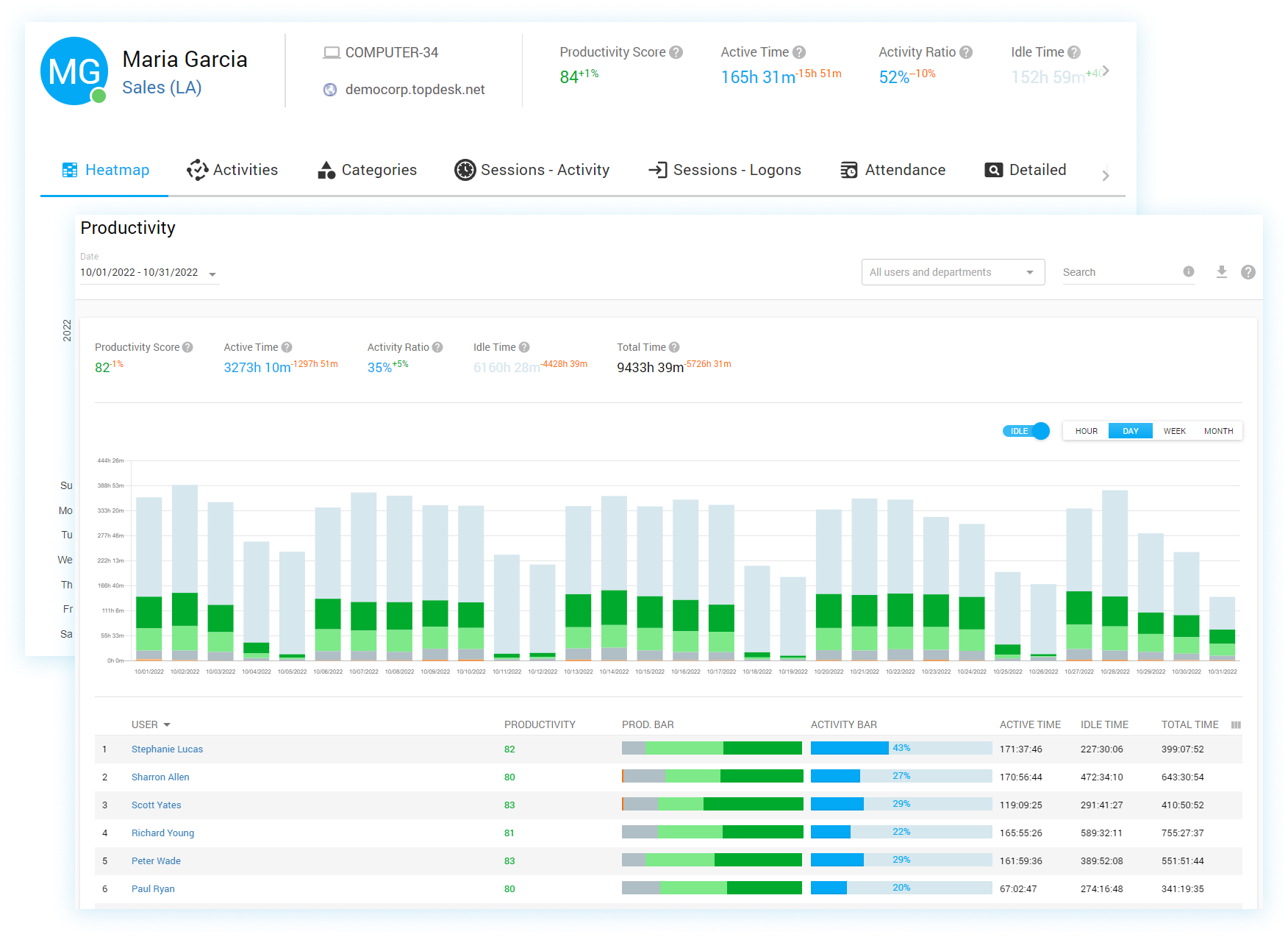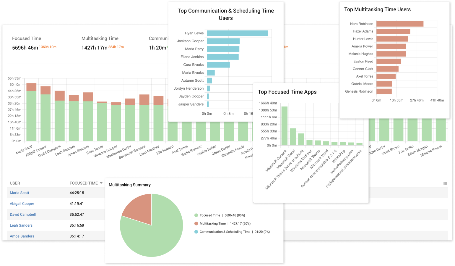 Analyze employees activity patterns to determine when employees are focused on a single task vs when they spend time switching between activities or utilize communication and scheduling tools. By analyzing the daily routines of top performers, you can enhance coaching strategies and drive higher productivity across the team.