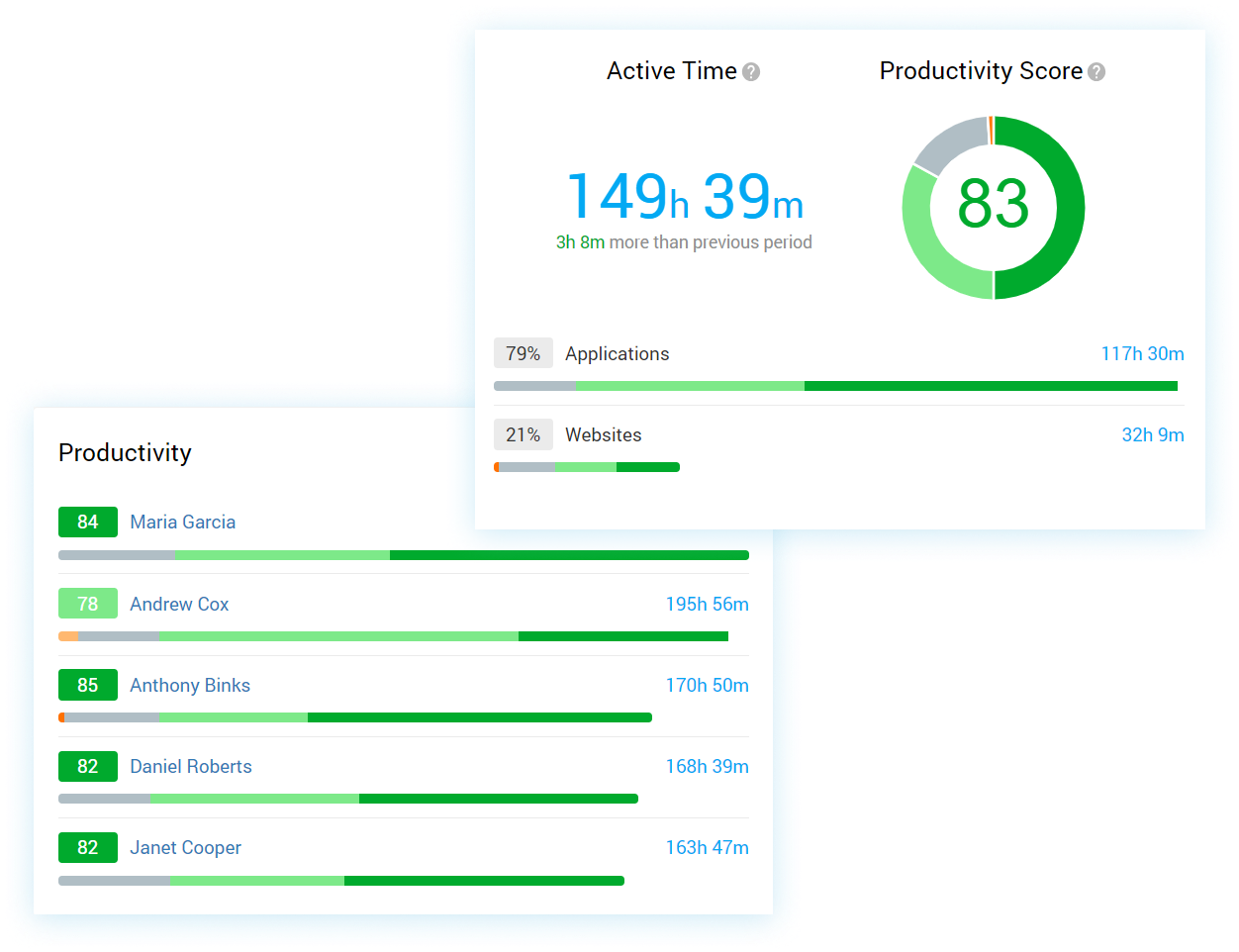 Use automatically generated KPIs to effectively assess and compare the productivity of individual employees, different teams, or a whole company across various time spans.