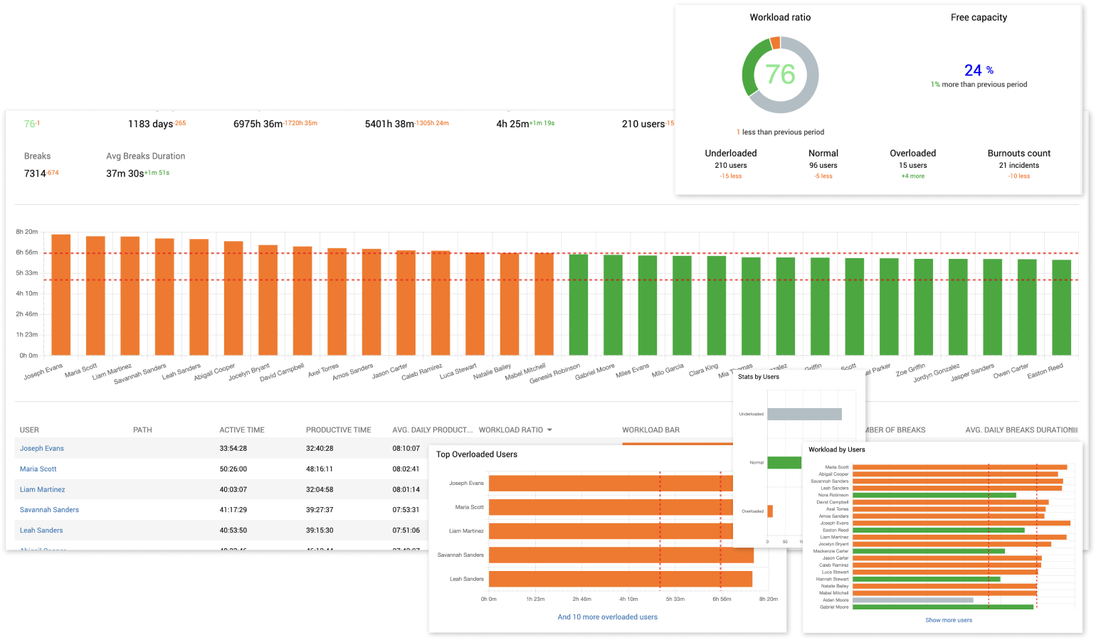 Gain real-time insights into employee workload and engagement. Identify team members who are overloaded or underutilized, and easily redistribute tasks to maintain balance. Monitor daily break patterns and proactively detect signs of burnout—triggered when an employee experiences sustained overload across multiple consecutive days.