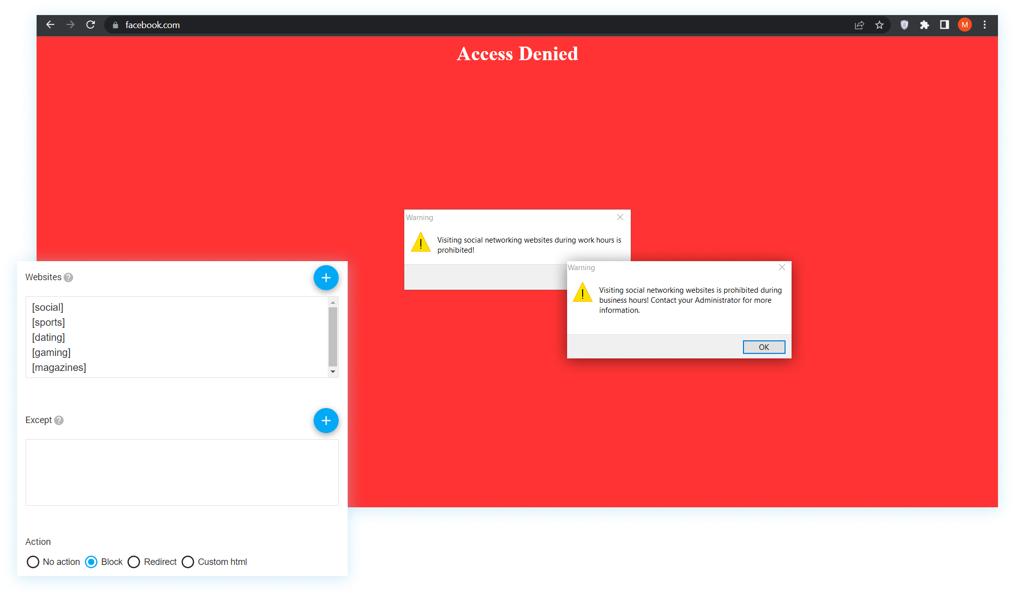Protect your data assets from malicious insiders, reduce workplace misconduct risks, and neutralize productivity killers with the help of Think Track’s intelligent blocking features. You can block potentially harmful, inappropriate, and distractive websites, social media apps, and nonwork messengers or forbid inserting USB flash drives based on employees’ roles and work schedules.
