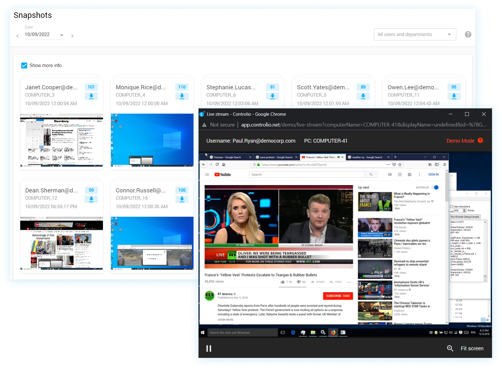 Keep your finger on the pulse by assessing employee activity in real time, and give timely guidance to mitigate productivity loss, and deflect malicious behavior. The Online Sessions report clearly shows which activity each employee is interacting with while granting optional access to the live stream of his screen.