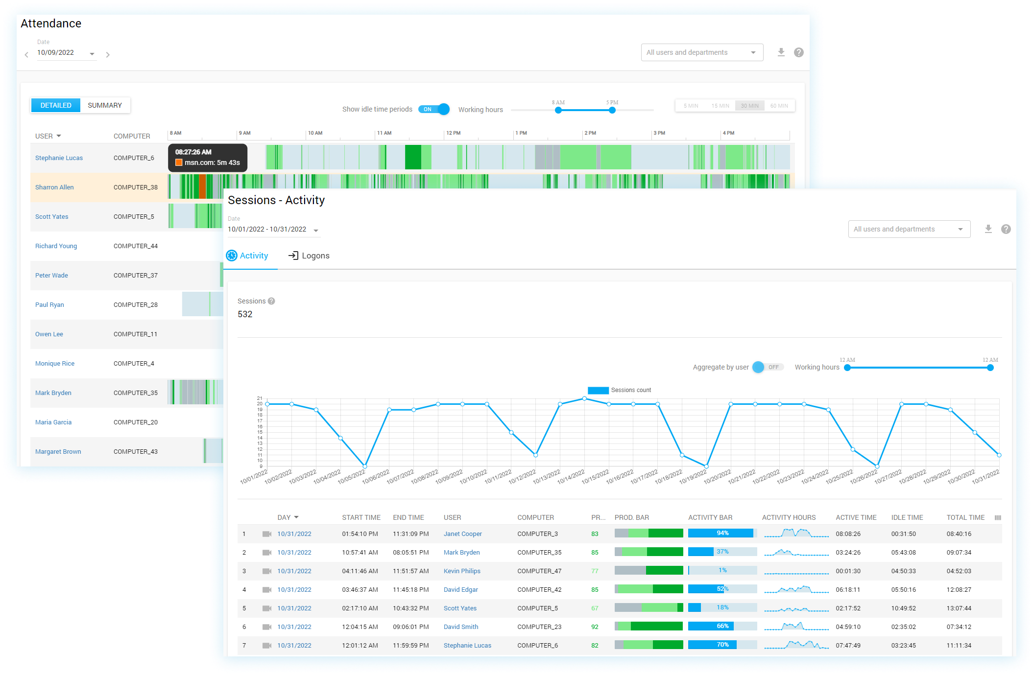 Usually, employee monitoring software records total, active, and idle times spent by users performing various computer activities based on their interaction with the mouse and keyboard. These data serve to evaluate employee engagement, track breaks, spot workplace absence and distractions, or calculate billable hours spent in work apps. Some solutions offer manual clock in/out, while others automatically record the start and end of working sessions. Think Track products provide even two options: the logon/logoff time of user sessions and the start/end of their computer activities.