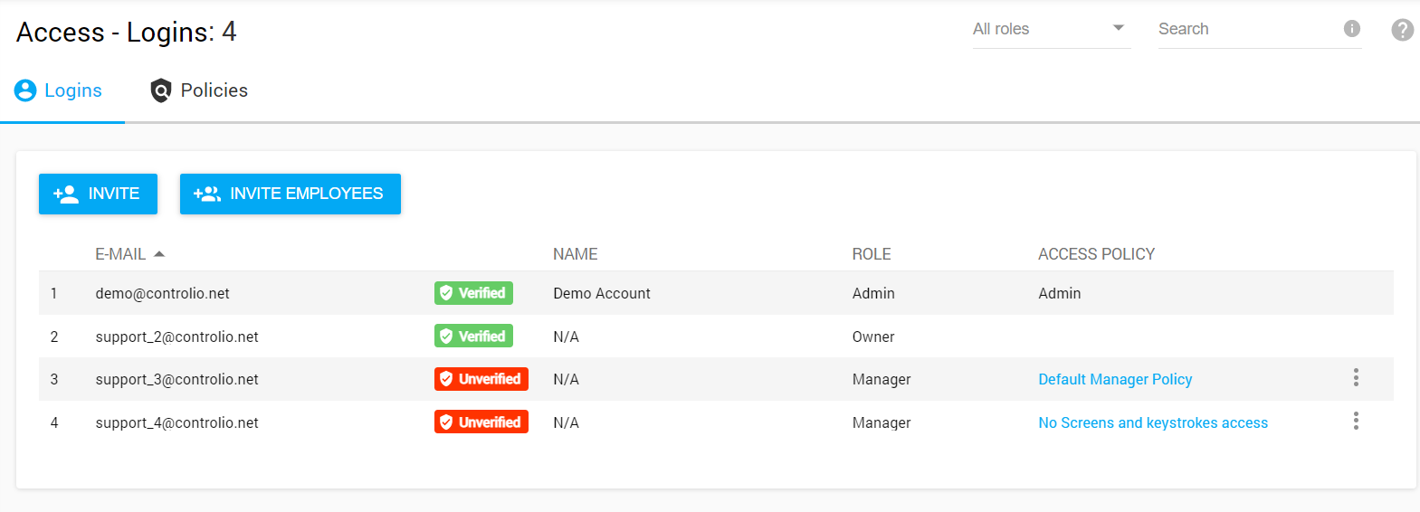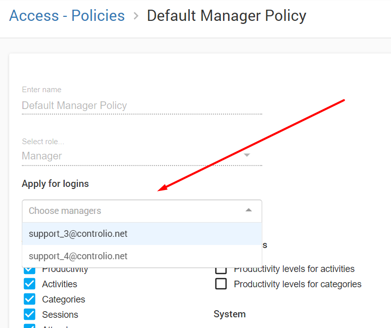 Policies are rules that define a set of manager’s/employee’s access permissions – to view reports, to edit categorization settings, and to view live streams or screen recordings.