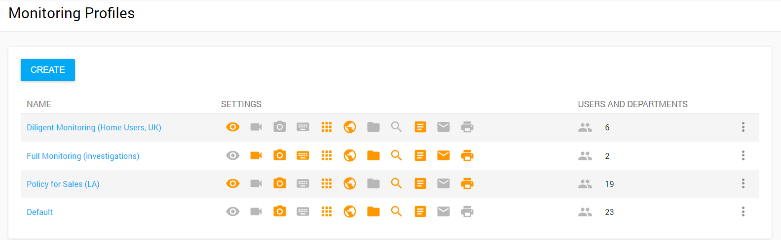 In the virtual demo account, we have a few monitoring profiles that can help demonstrate the versatility across them, for example, “Diligent monitoring” (Screen recording, Snapshots, Keystrokes, and emails tracking are disabled), and “Full monitoring” (the tracking of all features will be enabled to conduct an investigation on users with a lower level of efficiency).