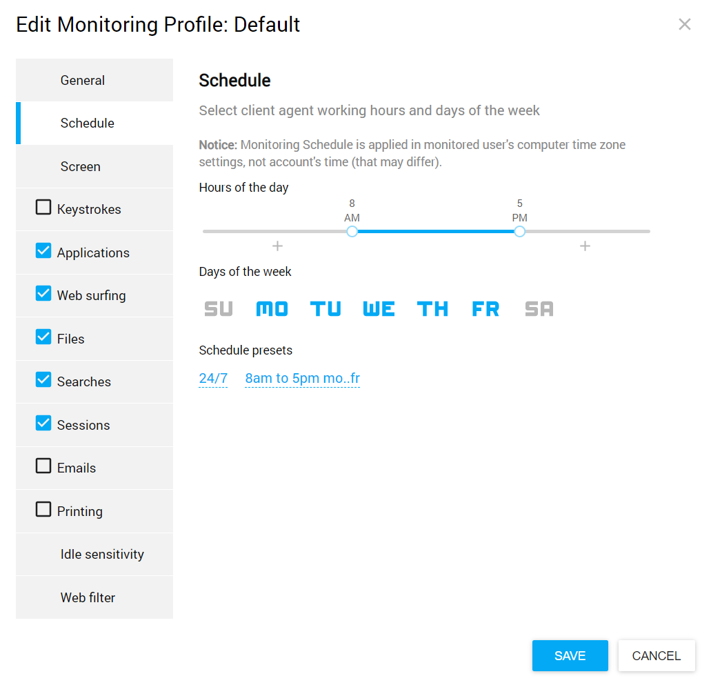 From this section, you can set up and control when users will be monitored. With the help of the Hours and Days selectors, you can specify exactly at which hours of the day, and on which days of the week user activity will be tracked.