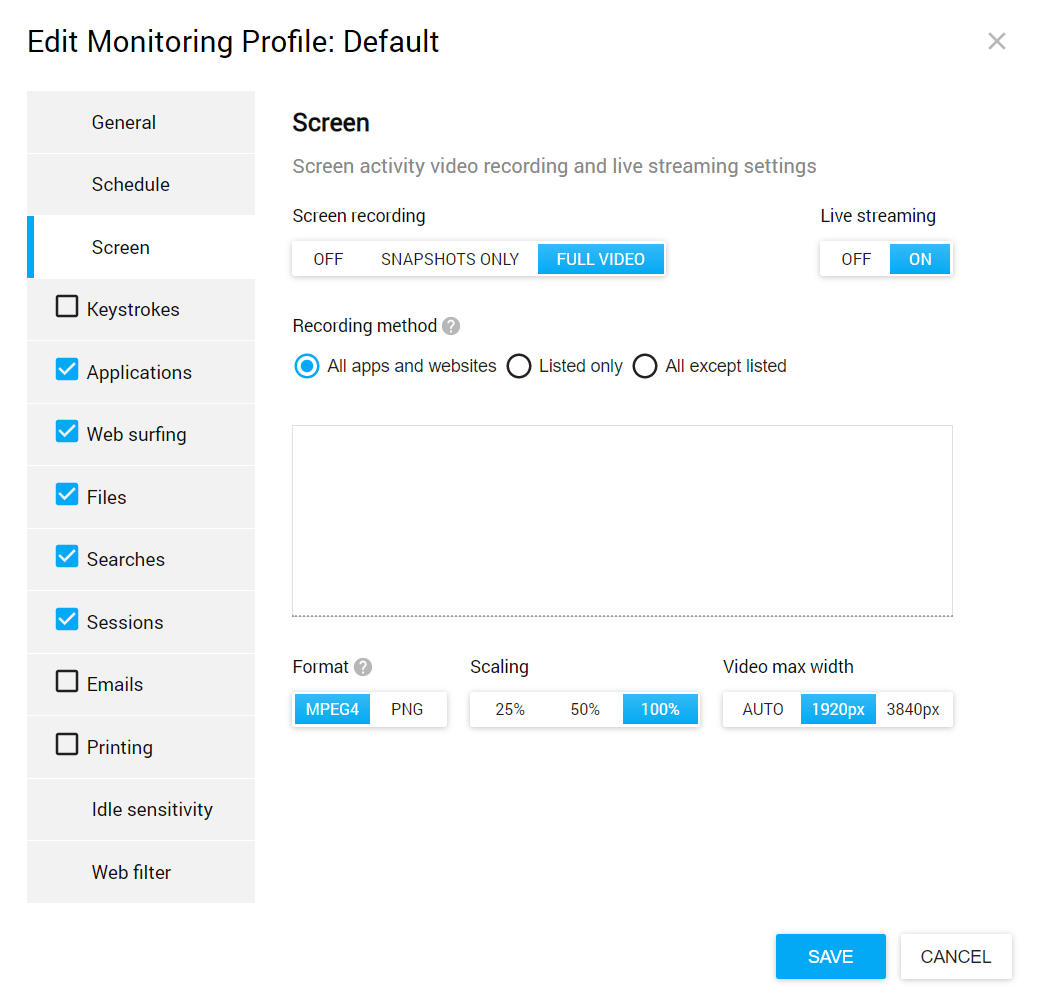 In this section, you can enable/disable capturing snapshots, live stream of the screen, and continuous screen recording. Note that the screen will not be recorded during idle periods (when a user makes no action on the mouse or keyboard).