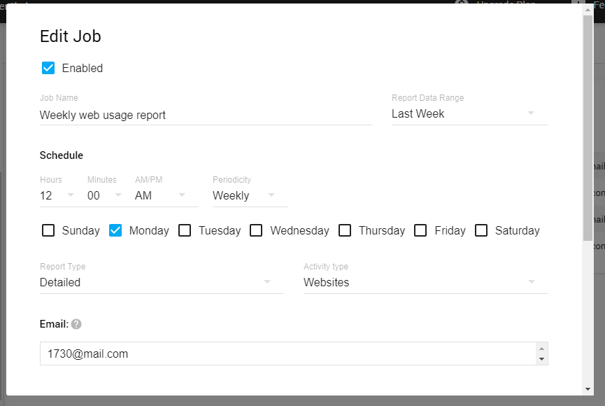 In order to set the parameters for the new report, click on the “Create” button. To edit the parameters, click on the name of the report in the column “Job Name”. In the window that opens, you should complete the following steps: enter the Job Name and Report Data Range, set the time for receiving the report, select the Report Type and Activity Type, and enter the email for recipients of the report.