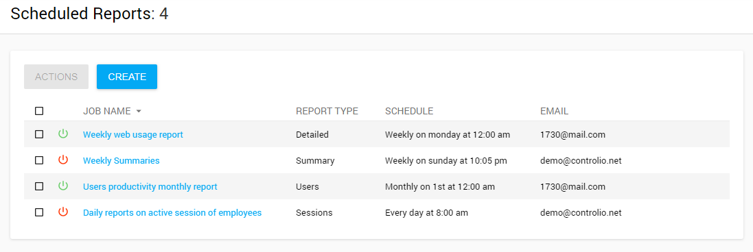 A green icon to the left of the report name indicates that report is enabled and it will be provided at the time specified in the “Schedule” column.