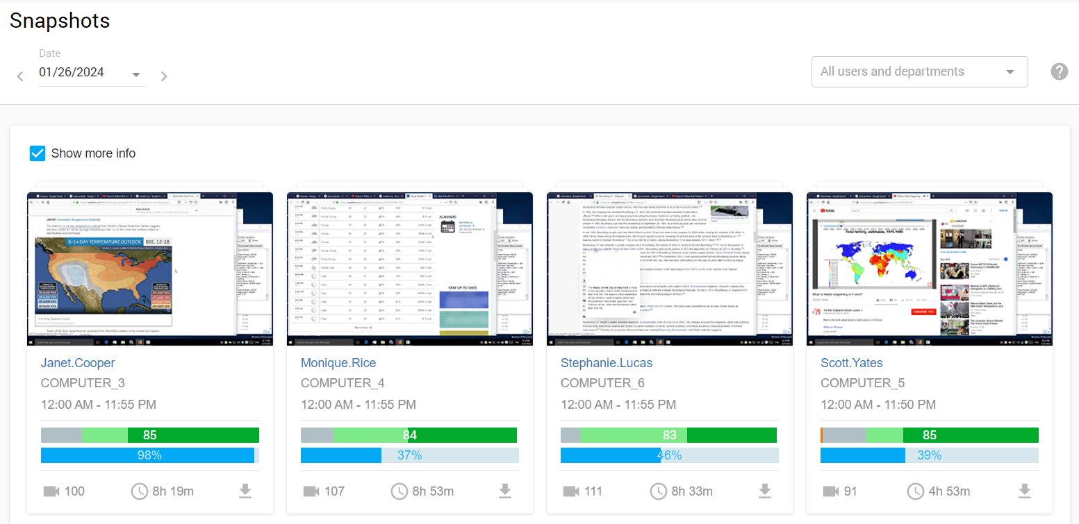 Snapshots are quick previews of the screen recording that are taken with a periodicity of 5 minutes typically used to help you visually navigate your way throughout work hours to detect any abnormalities. A snapshot folder will be available for each user on each day with a brief productivity summary.