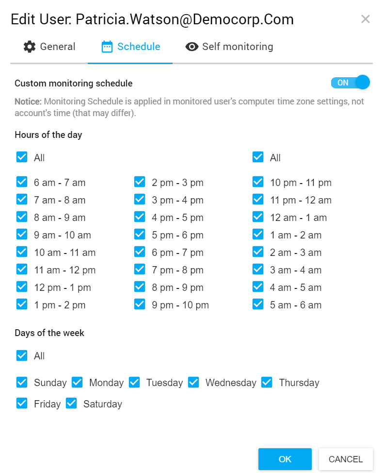 - Schedule Icon: Assign a custom monitoring schedule for a user or keep the one inherited from his monitoring profile.